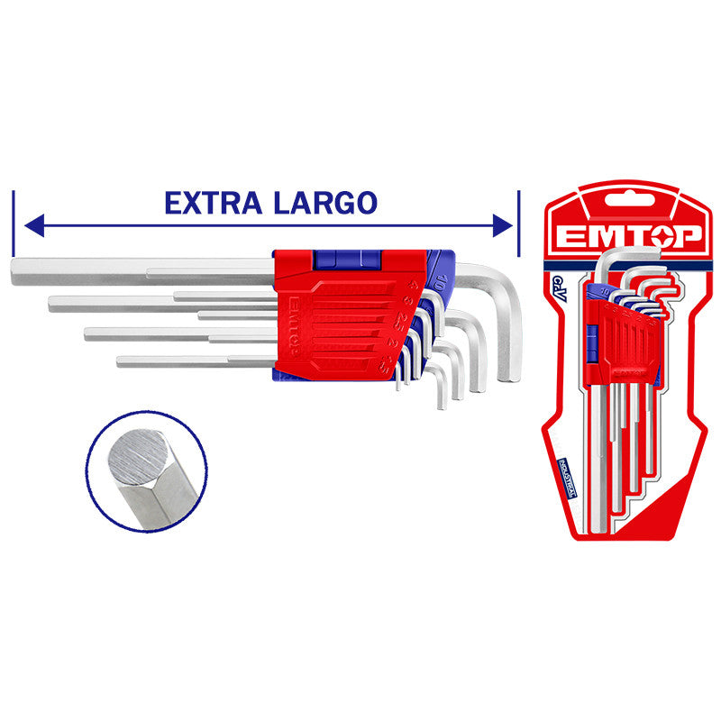 MARCA: EMTOP Juego de llaves hexagonales 9 piezas Material: Cr-V Tamaño: 1,5 - 10 mm Brazo extralargo Tratamiento termico y... Leer más...